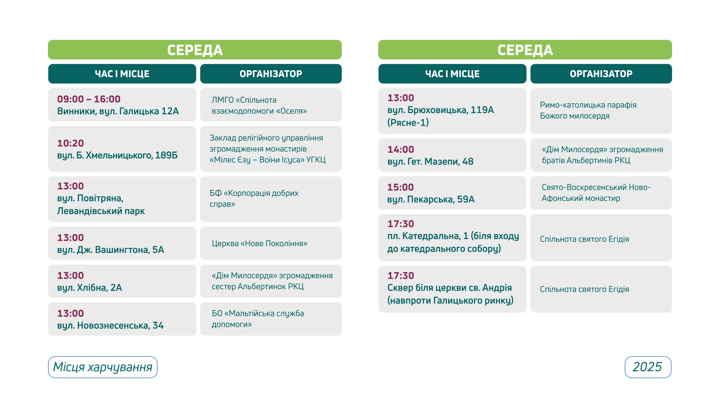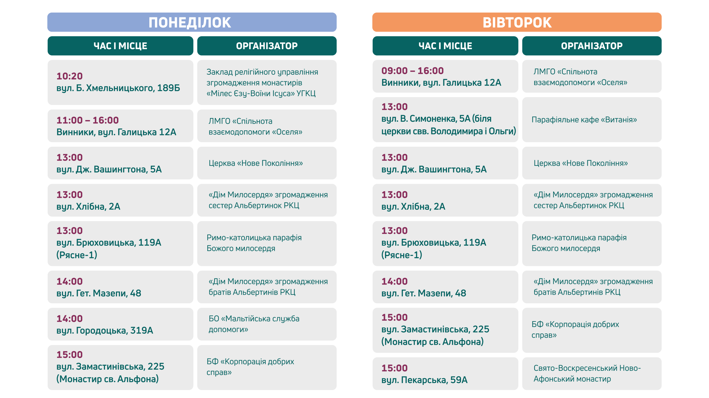 Щодня упродовж тижня, у різні години, бездомні та люди у потребі можуть отримати безплатні гарячі обіди. Центр “Джерело” підготував оновлену інформацію про актуальні локації харчування для бездомних та людей у потребі.