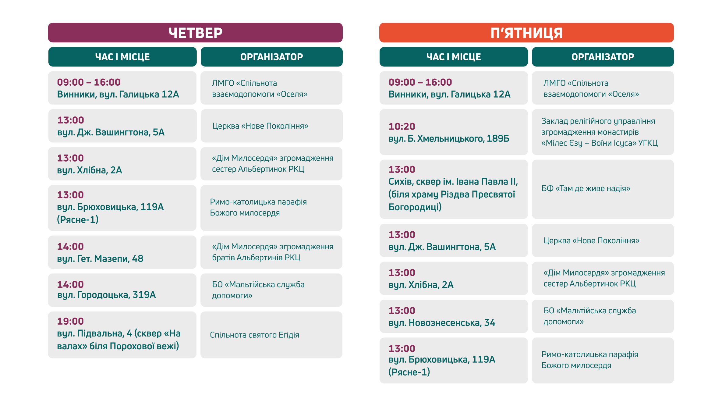 Крім того, 31 жовтня у Львові розпочав роботу “Автобус турботи”. На відміну від попередніх років, цього року проєкт стартував на місяць раніше. Щоп’ятниці автобус вирушає від Порохової вежі на вул. Підвальній і везе безпритульних людей до центрів надання соціальної допомоги. У листопаді – це філія соціальної роботи з бездомними людьми Центру “Джерело” на вул. Кирилівській, 3а, у грудні – спільнота взаємодопомоги “Оселя”, що у Винниках, в січні та лютому – ці ж локації, але за окремими графіками. Там люди можуть прийняти душ, випрати одяг, отримати змінні речі та взуття, поїсти, пройти медогляд, консультацію соціального працівника. За потреби їм допоможуть із відновленням документів, пошуком роботи чи житла, а також нададуть можливість залишитися на ночівлю або денне перебування.