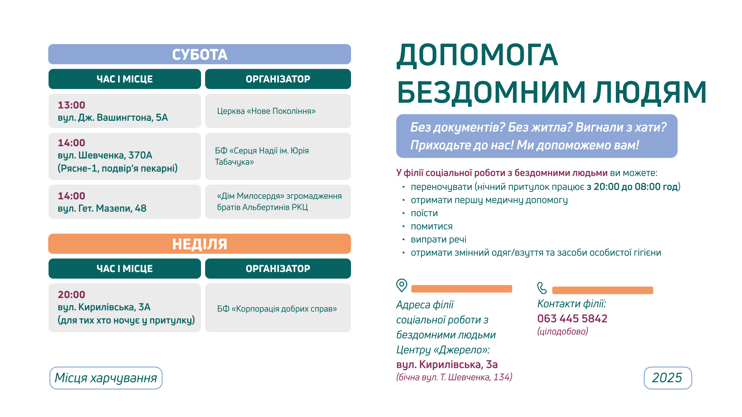 Надворі похолодало, а отже варто пам’ятати, що поруч є люди, які опинились без дому та потребують нашої підтримки. У філії соціальної роботи з бездомними людьми Центру соціальних послуг “Джерело”, що на вул. Кирилівській, 3а, працює єдиний у Львові муніципальний притулок для бездомних людей. Його нещодавно оновили та реконструювали, а також розширили послуги – тепер тут доступне і денне, і нічне перебування. Люди, які не мають своїх домівок, можуть зігрітися, отримати теплий одяг, поїсти та переночувати. Також у місті є кілька інших організацій, які надають допомогу бездомним та людям у потребі, зокрема забезпечують гарячими обідами (завантажити файл з переліком локацій можна за посиланням тут ).
