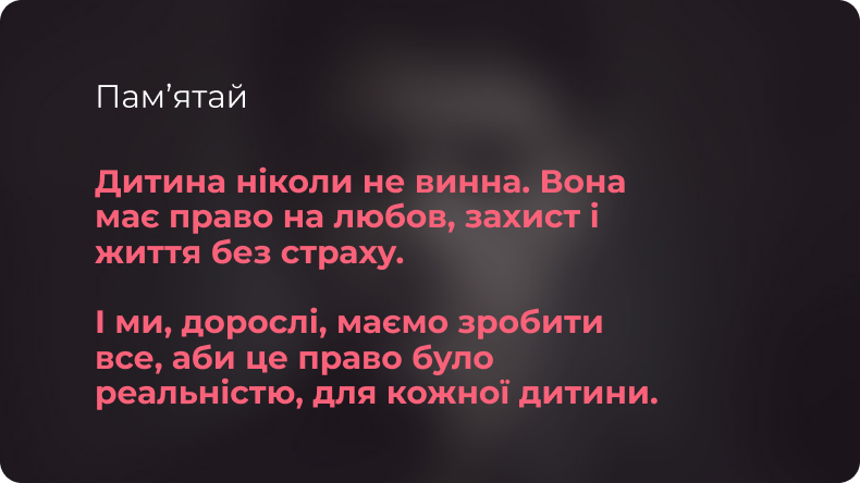 Дитина не має пояснювати чи виправдовувати травми або страх. Якщо бачиш тривожні ознаки – важливо не ігнорувати, а діяти. Безпечне дитинство – це відповідальність дорослих.